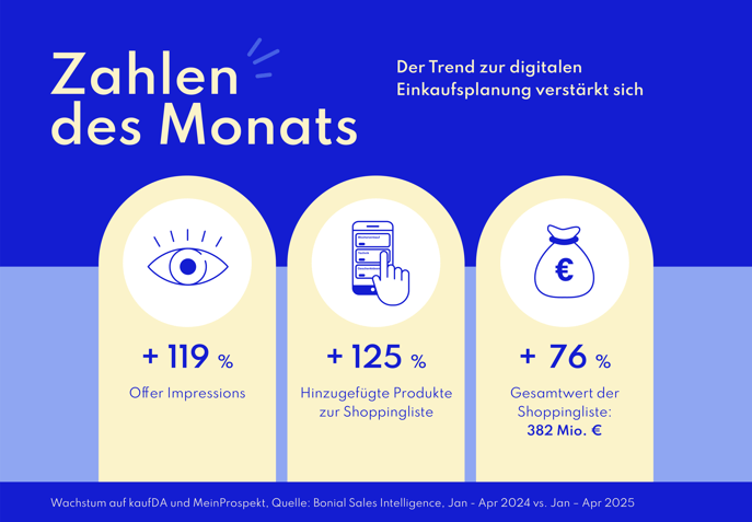 Besonders freuen wir uns über die ersten Einblicke, die wir in unsere "Laborküche“ gewähren konnten: Spannende Innovationen stehen bevor – und erste Erfolge unserer Umstellung auf Offers sind bereits sichtbar! Unsere Shoppingliste verzeichnet 125 % mehr hinzugefügte Produkte und einen Gesamtwert von 382 Millionen Euro – ein Wachstum von 76 % im Vergleich zu 2024. Das zeigt deutlich: Digitale Planung, smarte Angebote und starke Daten sind gefragter denn je. Weitere Informationen in unseren "Zahlen des Monats".